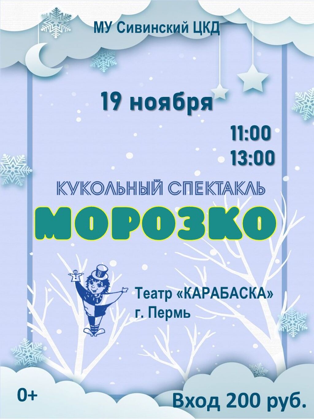 МУ Сивинский ЦКД приглашает маленьких и больших зрителей на яркий, музыкальный, ироничный кукольный спектакль «Морозко» по мотивам русской народной сказки в исполнении театра «Карабаска» (г. Пермь). Зимняя история о том, как Настенька отправляется за клюквой для своей сестры Парашки и в зимнем холодном лесу встречает Морозко...