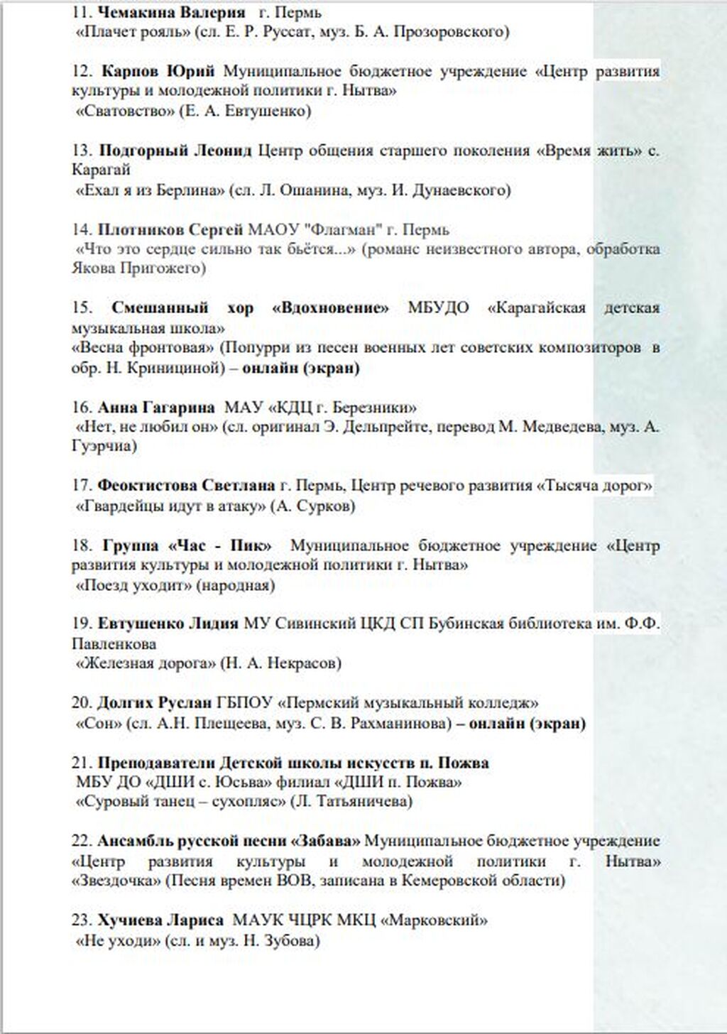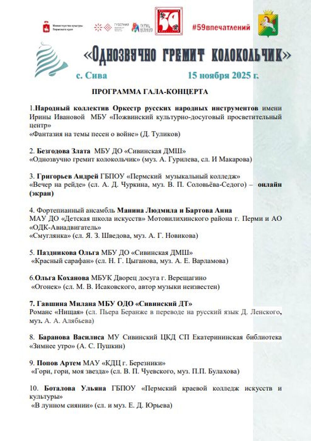 Программа выступлений участников Гала-концерта VII открытого фестиваля-конкурса романса "Однозвучно гремит колокольчик" 15 ноября 2025г.